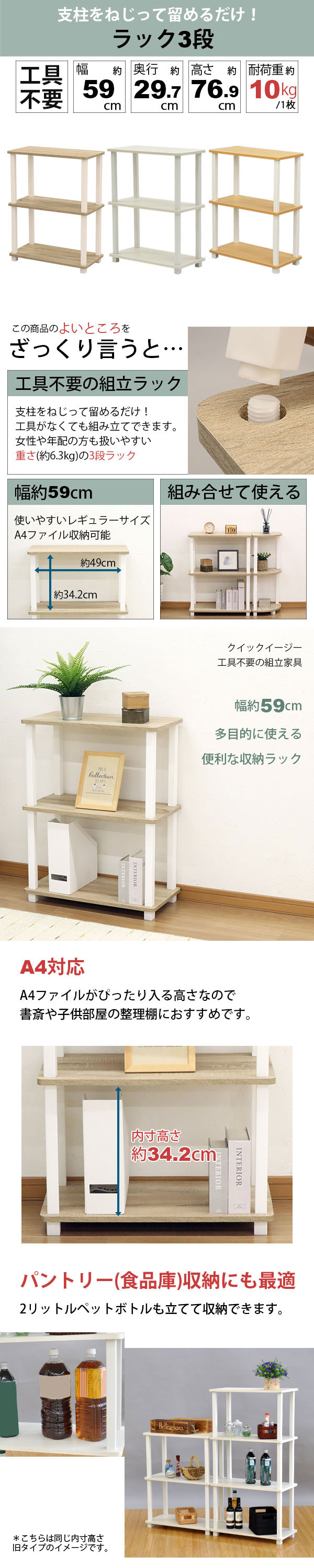 支柱をねじって留めるだけ! ラック3段 の詳細