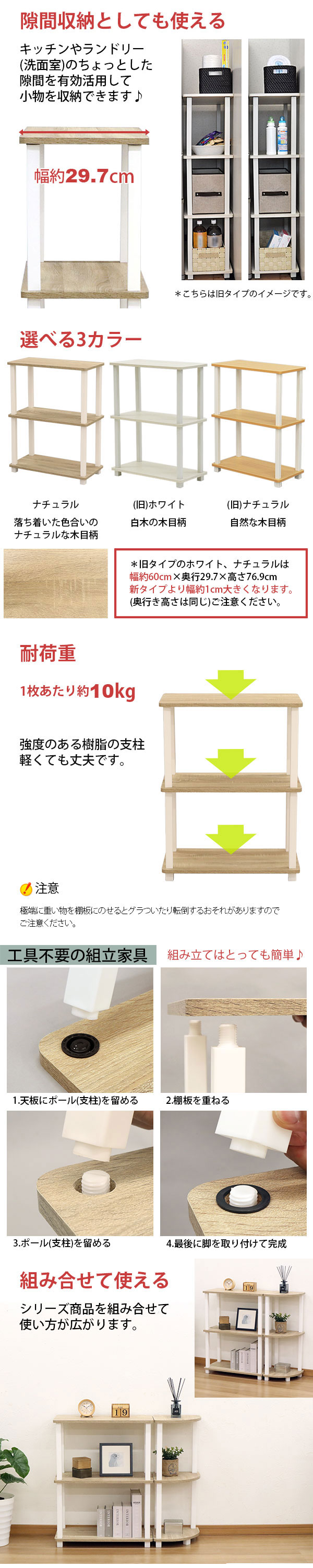 外寸(約):幅59×奥行29.7×高さ76.9cm (約60×30×77) 棚板(約):幅59×奥行29.7×厚み1.5cm 内寸(約):幅49×奥行19.7×34.2cm 脚高さ(約):4cm ※支柱の締め方次第で高さに数ミリ単位の誤差が出る場合がございます。 *旧タイプのホワイト、ナチュラルは幅約60cm×奥行29.7×高さ76.9cm 新タイプより幅約1cm大きくなります。 (奥行き高さは同じ)ご注意ください。 |