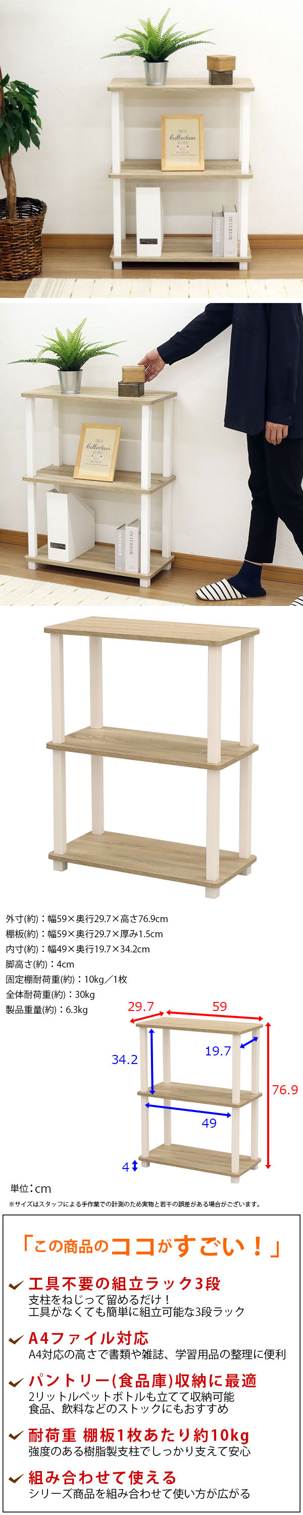 収納ラック 3段 オープンラック3段 工具不要 簡単組立 幅60cm(59cm) 奥行30cm(29.7cm) 高さ76.9cm おしゃれ 棚 キッチンラック 調味料 サニタリーラック トイレ収納 ランドリー 洗面所 脱衣所 玄関 電話台 A4対応 飾り棚 シンプル 軽い 軽量 隙間収納 ブラウン QSVP-2 NQ-3