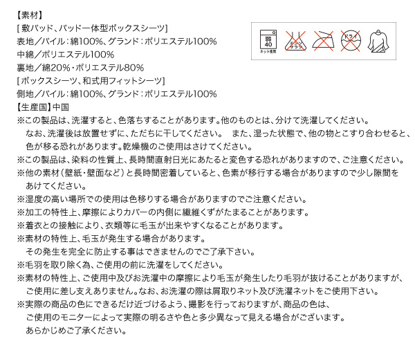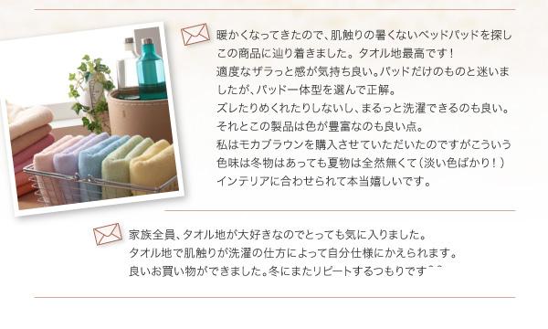 20色から選べる!お買い得同色2枚セット!ザブザブ洗えて気持ちいい!コットンタオルのボックスシーツ シングル アイボリー ![]() ![]() ![]() ![]() ![]() ![]() ![]() ![]() ![]() ![]() ![]() ![]() ![]() ![]() ![]() ![]() ![]() ![]() ![]() ![]() ![]() ![]() ![]() さっと敷くだけでさらさら快適! コットン100%のタオル素材! コットンタオルのパッド・シーツ 汗をかいてもサラサラ快適! きめ細かなパイルは暑い季節には汗や湿気を 吸い取ってくれて、べたつかず、さらさら快適。 親しみあるタオル素材にふわっと触れるだけで癒され、なんだか安心して、365日ぐっすり眠れそう。 コットン100%の心地よさ 肌にあたる部分の素材はコットン100%。 肌にやさしく、天然素材ならではの心地よさを感じることができます。 手軽にさっと付けるだけ! パッド・シーツはさっとつけるだけで寝心地がグッとよくなります。 手軽にタオルの気持ちよさを味わえるアイテムです。 ザブザブ洗えて気持ちいい! 汗をかいてもすぐ洗えるから、いつでも清潔キープで気持ちいい。 洗いたてのふかふかのタオルに飛び込むような、至福の心地よさをいつでも感じることができます。 タオル素材はお洗濯で、やわらかさや香りを自分好みに変えられるのもうれしい。 ご家庭の洗濯機で丸洗いできるのでこまめに洗いたい季節にもぴったり。 汚れもさっと落とせて、乾きも早く、手軽に洗い替えできるから何枚でもほしくなるアイテムです。 ●ボックスシーツ マットレスにかぶせるだけ!カンタンに肌触りを楽しめる。 すっぽり覆いたい人、敷パッドは別で持っているという方にオススメ! 見た目すっきりで肌触り気持ちいい! 全周ゴム仕様 20色から選べる!お買い得同色2枚セット!ザブザブ洗えて気持ちいい!コットンタオルのボックスシーツ シングル アイボリー 【サイズ】 ボックスシーツ2枚セット シングル100×200cm +25cm(厚みマチ)×2 全周ゴム仕様 【カラー】アイボリー 【素材】 側地/パイル:綿100%、 グランド:ポリエステル100% 【重量】約0.8kg×2 |