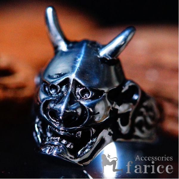和柄 2本角般若面(鬼女の能面)モチーフ ダブルサイド ファイヤーアラベスク(炎&唐草紋様) メンズ 和銀風 ステンレスリング