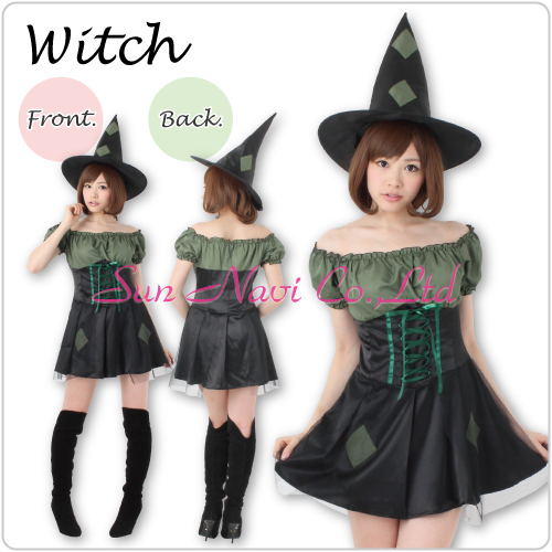 ハロウィン 魔女オフショルコスチューム ダークグリーン TOT119│仮装/衣装/本格派魔法使い/とんがり帽子 3980円以上送料無料