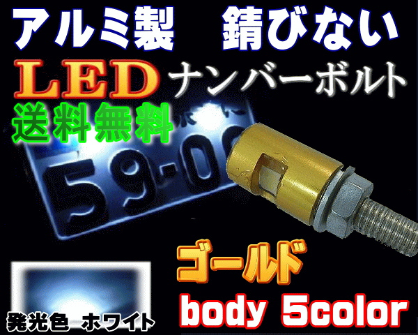 アルミナンバーボルト 金 【メール便 送料無料】 ゴールド LEDナンバーボルト 汎用 防水 バイク LEDナンバー灯ボルト LED内臓ボルト 汎用品 ナンバー灯 ボルト LED