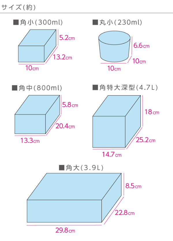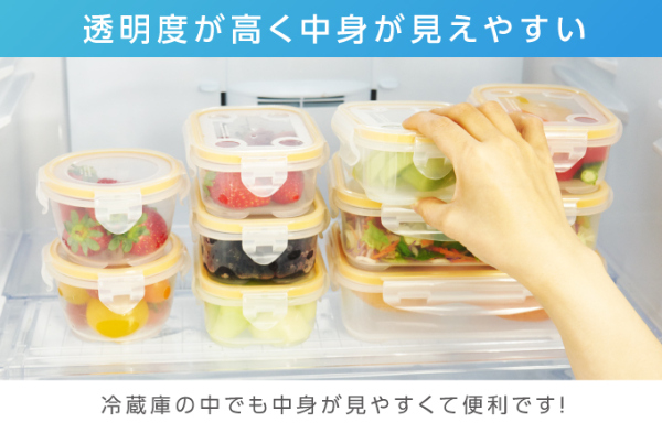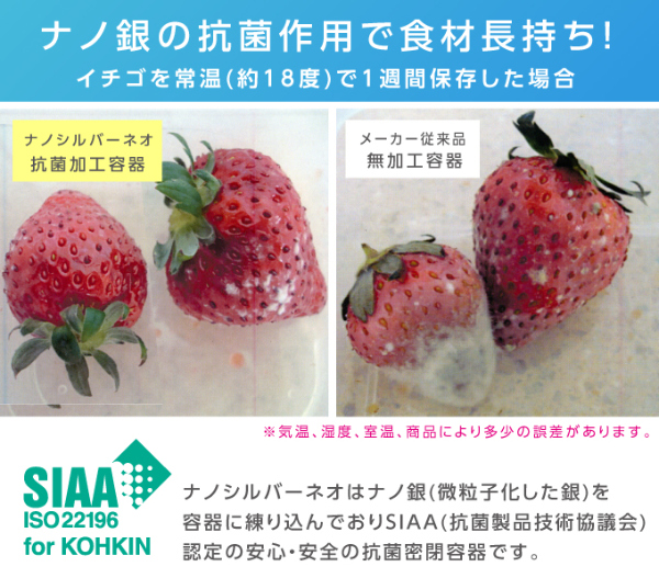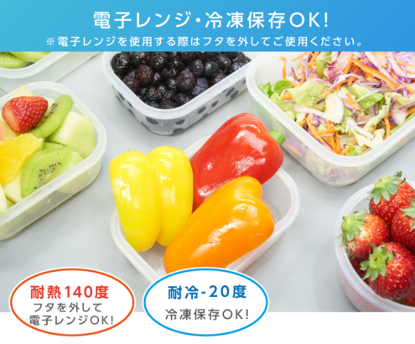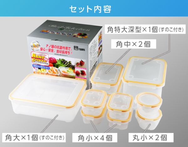 余らせて捨ててしまう野菜や果物の保存に…。鮮度が落ちやすい魚や肉の保存に…。食材の腐りやすい夏の食品管理に…。キッチンの必需品!食材がフレッシュで長持ち!食材を無駄にしないので経済的!ナノ銀の抗菌効果で、安心・安全、食材長持ち!【セット内容】角小:4個、角中:2個、丸小:2個、角特大深型:1個、角大(すのこ付):1個【寸法】角小:132×100×52、角中:204×133×58、丸小:100×100×66、角特大深型:252×180×147、角大(すのこ付):298×228×85【容量】角小:300ml、角中:800ml、丸小:230ml、角特大深型:4.7L、角大(すのこ付):3.9L【材質】ふた、本体:ポリプロピレン(銀ナノ粒子・シリコンゴム混合) パッキン:シリコン【耐熱温度】140℃【耐冷温度】-20℃