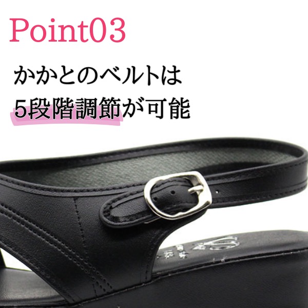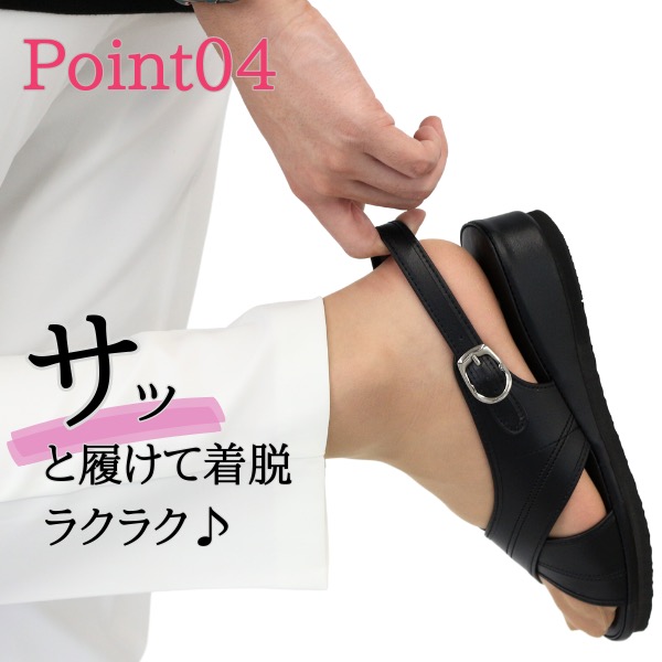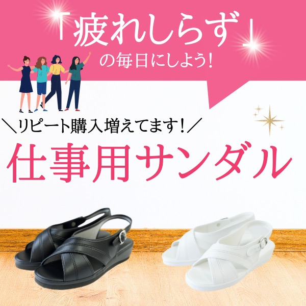 | pure walker ピュアウォーカー 「シンプルで軽く、やさしい足音。」SS〜3L幅広いサイズ展開!! 【pure walker】からナースサンダルが登場! 黒と白のみ、小さいサイズSS(20.5-21.0cm)〜大きいサイズ3L(25.5-26.0cm)の幅広いサイズ展開に対応! ヒール高4.0cmのローヒールタイプ。 バックベルトはサイズ調節可能! ヒール部分に木製ヒールを使用し、歩行時の音を抑え、長時間履いても疲れにくい。 中敷にはゴム入りスポンジを使用し、歩行時の衝撃を吸収! アッパー、中敷材に抗菌・防カビ素材を使用。 ソールかかと部分のノンスリップゴムで滑りにくい! オフィスでのお仕事履きに最適な一足です。 | ||||||||||||