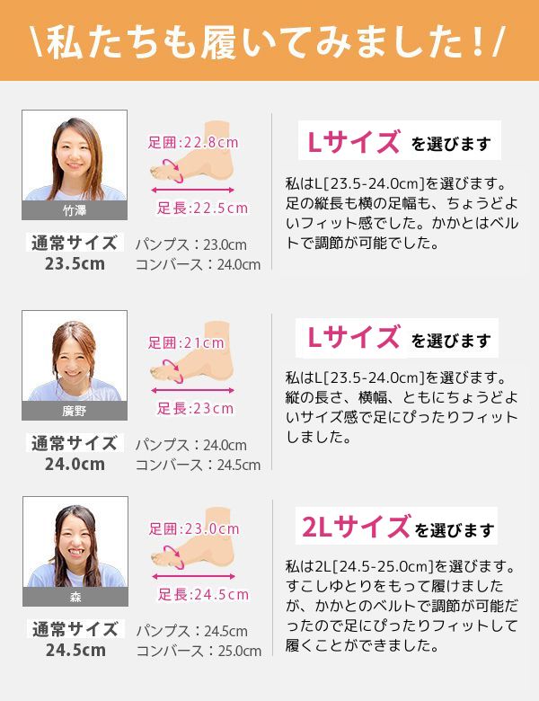 | こちらの商品は【一般的なサンダルサイズ】です。普段お履きのサイズをお選びください。 【女性スタッフRuu(20代 160cm) 普段のサイズは、パンプス23.5cm/日本製スニーカー23.5cmです】私のジャストサイズはL[23.5-24.0cm]した。ストッキングを履いて、程よくフィット感のあるサイズです。 甲高・幅広の方はワンサイズ上をオススメします。 |