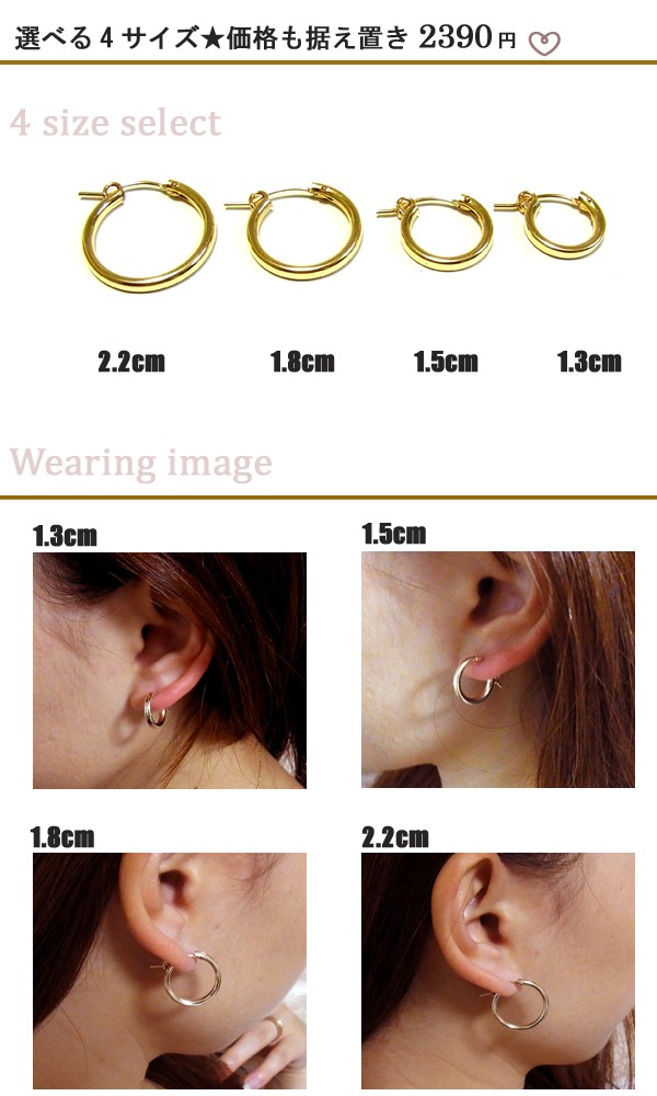 選べる4サイズ★価格も据え置き2390円!カチッと差し込むだけの手軽さと何にでもあわせやすいシンプルフープは普段使いにも最適です。