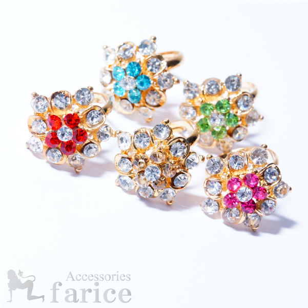 カラフルカットビーズ装飾 スター&フラワー レディース フリーサイズリング【選べる5カラー/赤 or ピンク or 金 or 水色 or 黄緑】