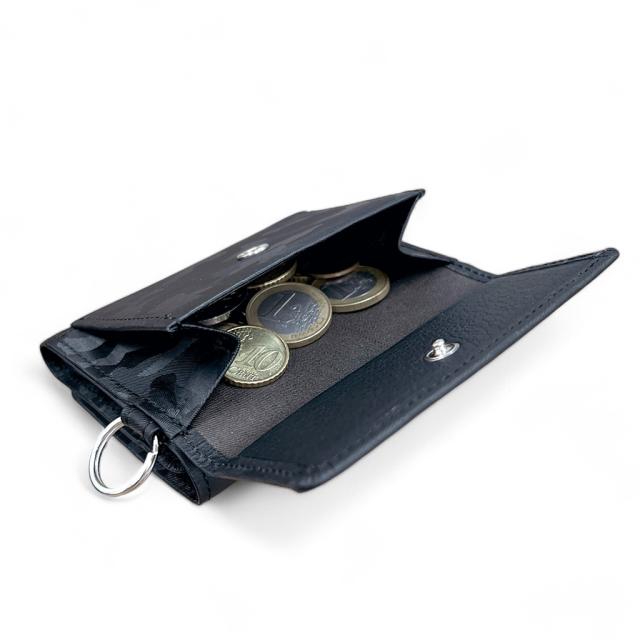 オリジナルの迷彩柄を型押しした革を用いた、バリエーション豊かな革小物のシリーズです。 POINT 01 札入れが2つとカードポケットが3つ、 フリーポケットが3つあります。