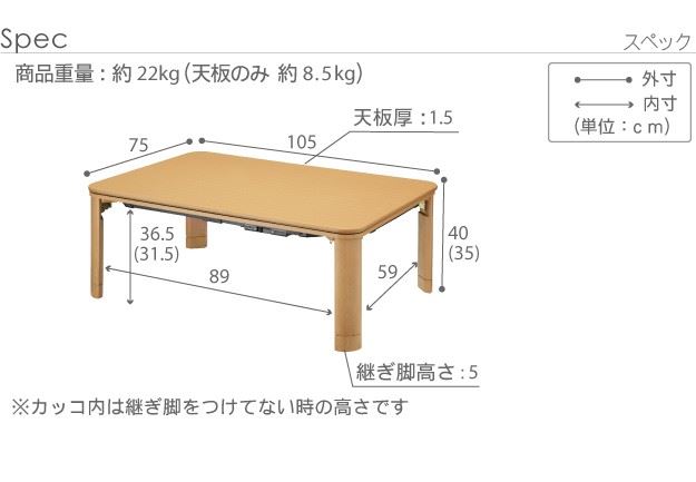 サイズ:幅105x奥行75x高さ40cm(35+継ぎ脚5cm)・約21.5kg
