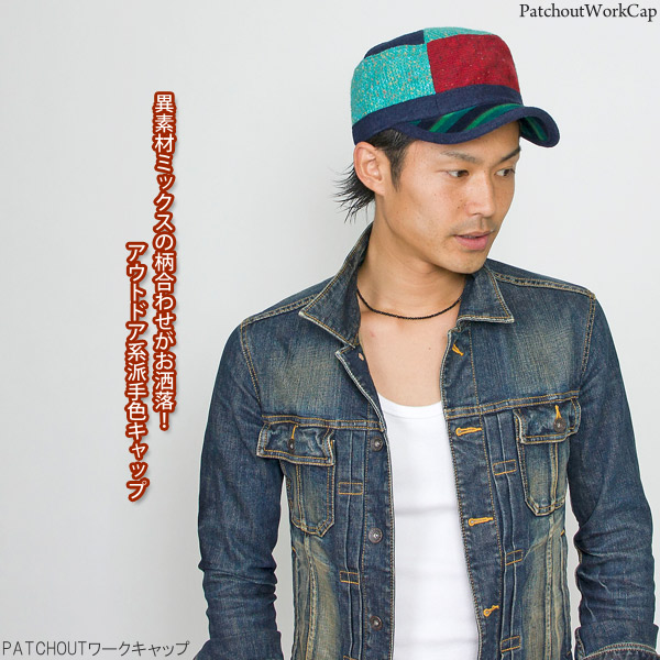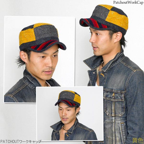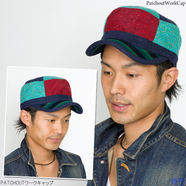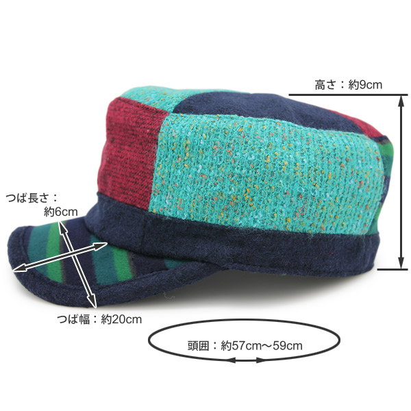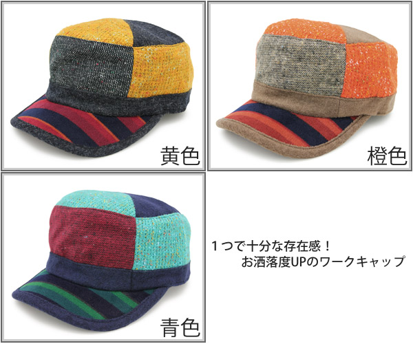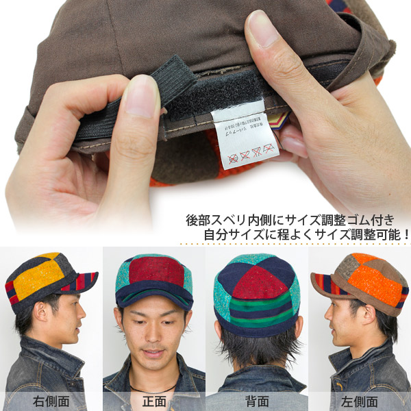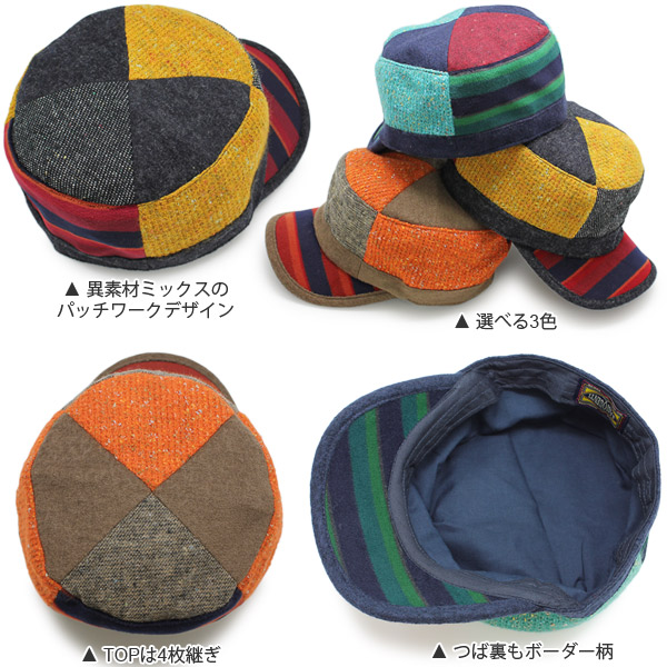 それぞれにお洒落なボーダーやツイードなど、様々な柄や色を組み合わせた、味わい深いデザインのワークキャップです。 異素材ミックスだからこその個性的な派手さと、どこか温かみのある親しみやすさがあり、被っているだけでお洒落度が増すハンサムなキャップです。 後部にはサイズ調整用のゴムがついていますので、テープで調整してご自身サイズに合わせてくださいね。