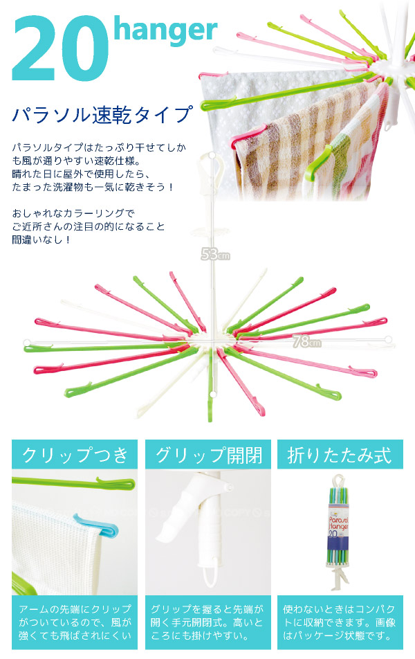こちらはタオルなどを効率よく掛けられるパラソル型ハンガーです。
