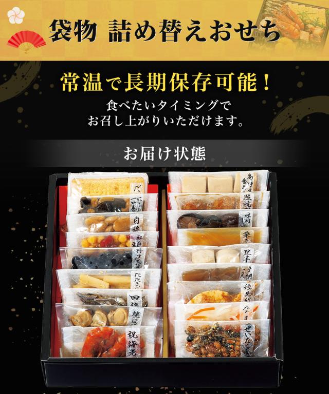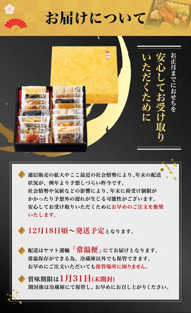 新年のお祝いに縁起物を揃えた人気のおせちです。