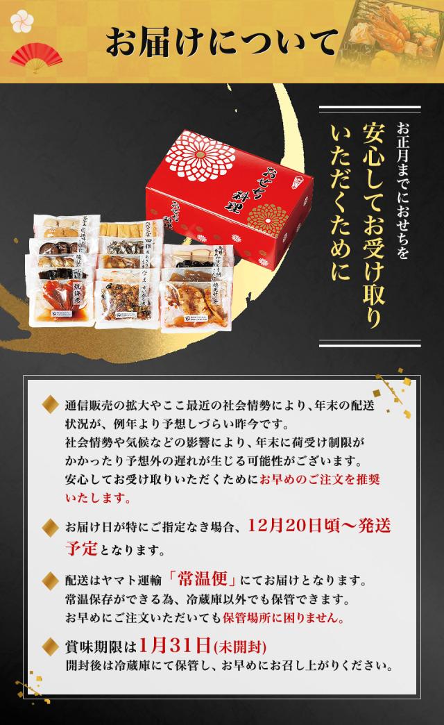- お正月まで10日程前に到着したので、そのまま冷蔵庫に入れて置きます。元旦に開けるのが楽しみです。