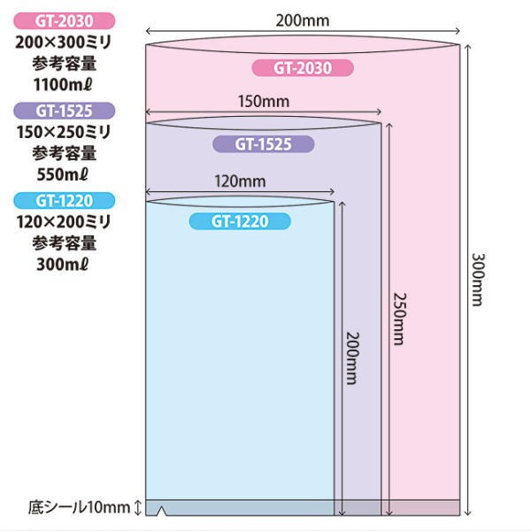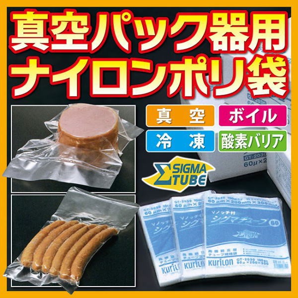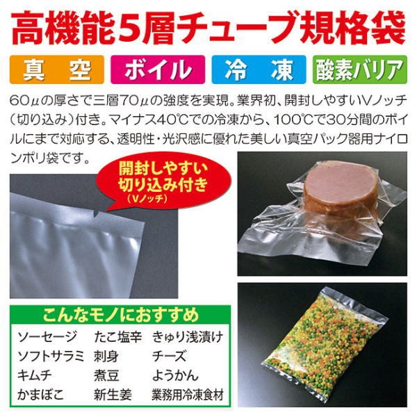 人気の業務用真空パック器 DUCKY(ダッキー)に対応の「業務用・真空パック器用ナイロンポリ袋」。60μの厚さで三層70μの強度を実現した五層高機能フィルム。-40℃での冷凍から、100℃で30分間のボイルまで一枚で対応する透明性と光沢感のある美しいチューブ袋です。【商品名】真空パック器用ナイロンポリ袋 シグマチューブ60 GT-1220 120×200mm 3,000枚入【サイズ・容量】GT-1220 : 120×200mm(参考容量:300ml) 厚み:60μ【対応温度】マイナス40℃(冷凍)〜100℃(ボイル)30分間まで【その他】ハイバリア品ではないため、脱酸素剤は使えません。レトルト梱包用途にはご利用いただけません。