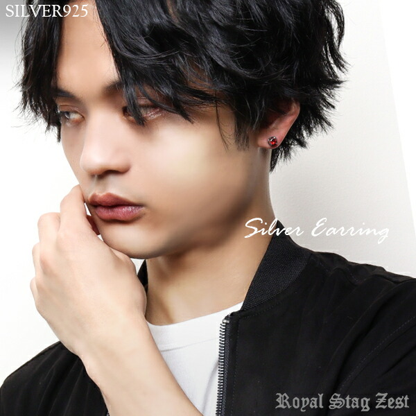 【Royal Stag ZEST】 ブラックカラー 一粒 レッドジルコニア シルバーピアス (1P/片耳用)