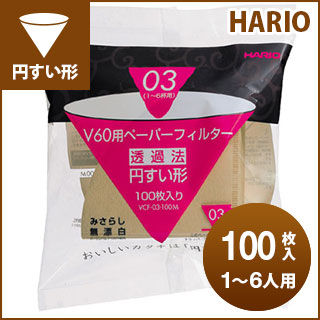 ハリオ式珈琲 V60用ペーパーフィルター(みさらし)[VCF-03-100M] 1-6人用 100枚入り