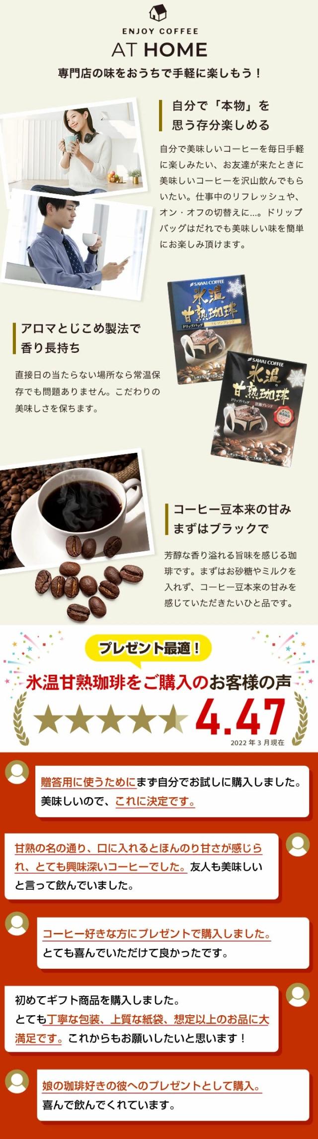| 内容量 | ドリップバッグコーヒー ・氷温ブルーマウンテン(5袋×1箱) ・氷温甘熟ブレンド(5袋×2箱) |