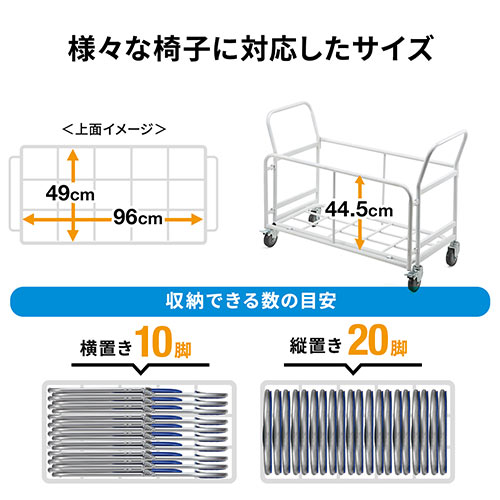 ●100-SNC037シリーズなどの折りたたみ椅子を収納できる台車です。●100-SNC037シリーズを横置きで10台、縦置きで20台収納できます。