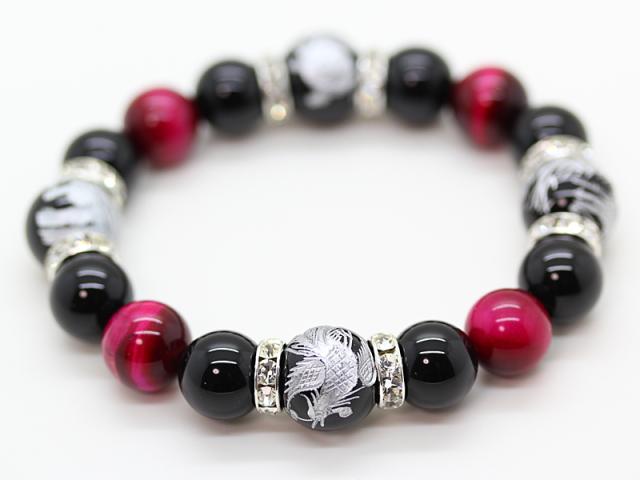 石輝 天然石ピンクタイガーアイ12mm銀彫四神獣オニキス14mmパワーストーン数珠ブレスレット