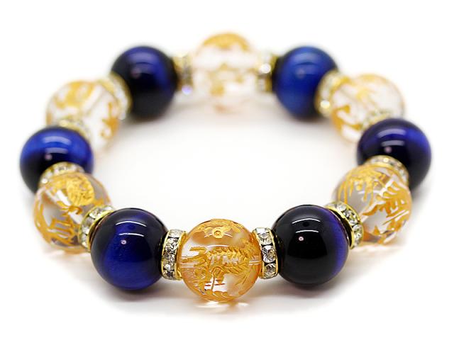 石輝 ブルータイガーアイ16mm金彫り一玉に四神獣水晶16mmパワーストーン数珠ブレスレット