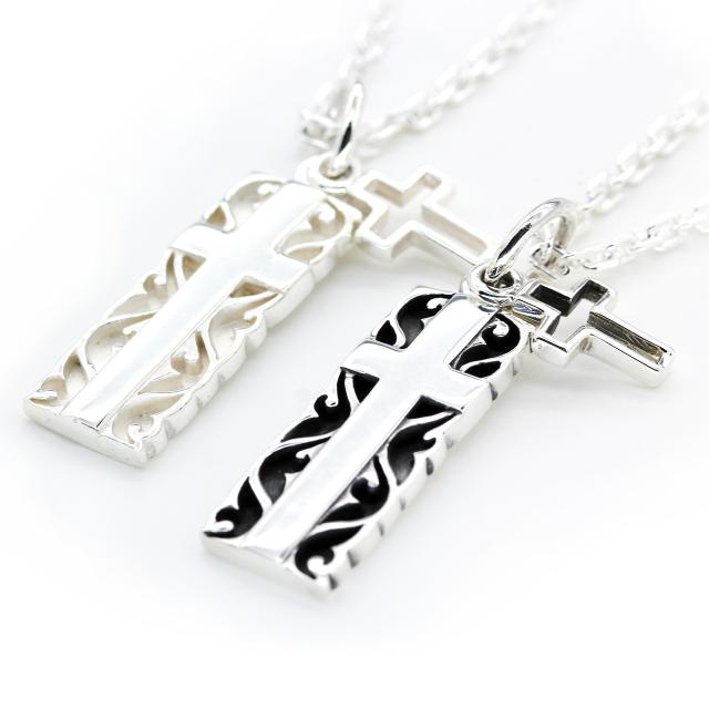 存在感のあるクロスプレートと小さなクロスがゆらゆら揺れる印象的なペンダントはクールとキュートを兼ね備えたデザインです。細かいところまで凝っているのでファッションにも合わせやすいおしゃれさで注目度も抜群です。素材は全体が輝かしい高級感のあるシルバーが使用されております。男女どちらも使用できるのがシルバーの良いところです。ハンドメイドなので人とかぶることも少ないですし、細部にまでこだわった装飾部分も1つ1つ丁寧に手作りでできております。もちろんオールシーズン使っていただけますし、ペアですのでカップルで使っていただけることでより二人の愛情が深まるようなデザインです。シルバーのジュエリーはたくさんありますがやはりクロスは性別や年齢を問わずクールなファッションもばっちり決まるアクセサリーです。シンプルなので学校などで使用するにもお勧めですし、重ねづけに他のアクセサリーとお使いいただいても邪魔することなくおしゃれにきまります。やはり恋人への誕生日やクリスマスなどのイベント時のプレゼントにもってこいのアイテムです。【材質・サイズ】ペンダント:素材 シルバー925メンズ&レディースサイズ 27mm×10mm(バチ...