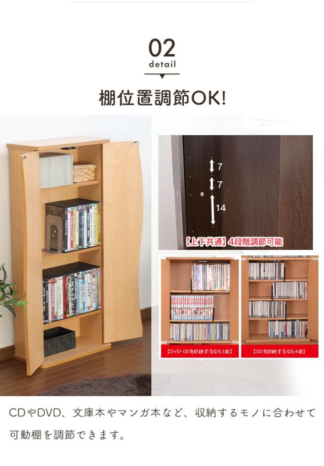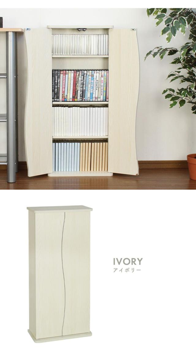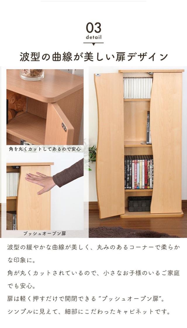 | 奥行20cmとスリムな見た目とは異なり、たっぷり収納できるキャビネット。 1段につき本なら約23冊、DVDなら約22本、CDなら約32枚程度収納が可能です。 ※収納物のパッケージの大きさによりますので、あくまでご参考程度となります。 扉デザインはゆるやかな波型の曲線で優しい印象に。 扉は軽く押すだけで開閉する「プッシュオープン式」を採用しています。 コーナーは角を丸くカットしているので、小さなお子様のいるご家庭でも安心してお使いいただけます。 |