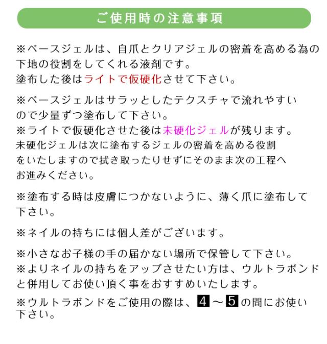 | 注意事項 | ベースジェルは、自爪とクリアジェルの密着を高めるための 下地の役割をしてくれる液剤です。 塗布した後はライトで仮硬化させてください。 ベースジェルはサラッとしたテクスチャで流れやすいので少量ずつ塗布してください。 ライトで仮硬化させた後は未硬化ジェルが残ります。 未硬化ジェルは次に塗布するジェルの密着を高める役割をいたしますので 拭き取ったりせずにそのまま次の工程へお進みください。 塗布する時は皮膚につかないように、薄く爪に塗布してください。 ネイルの持ちには個人差がございます。 小さなお子様の手の届かない場所で保管してください。 よりネイルの持ちをアップさせたい方は、ウルトラボンドと併用してお使い頂くことを おすすめいたします。 |