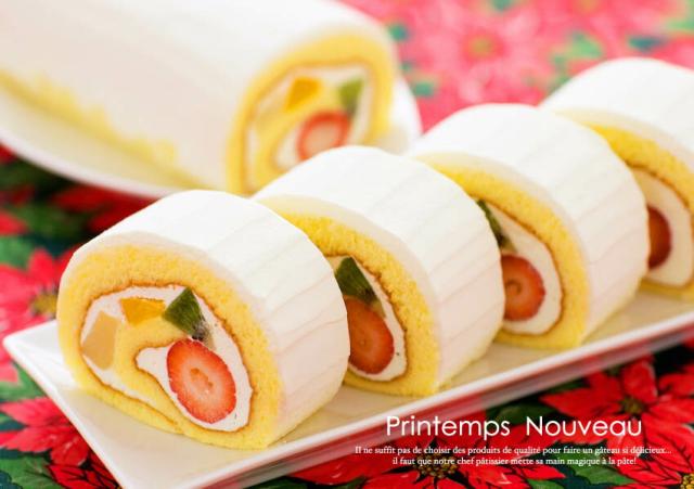 スペイン産オレンジの砂糖漬けをミルクチョコレートでコーティングしてチョコレートロールにのせております。 チョコレートガナッシュロールでオレンジカットを入れたクリームを巻いております。オレンジの香り芳醇なカカオの香りをお楽しみいただきたいチョコレートロールと、ロールケーキの王様プランタンヌーボー。苺・洋ナシ・ゴールデンピーチ・キウイを限界まで入れて巻き上げた、当店を代表するフルーツロールケーキをお楽しみ下さい!