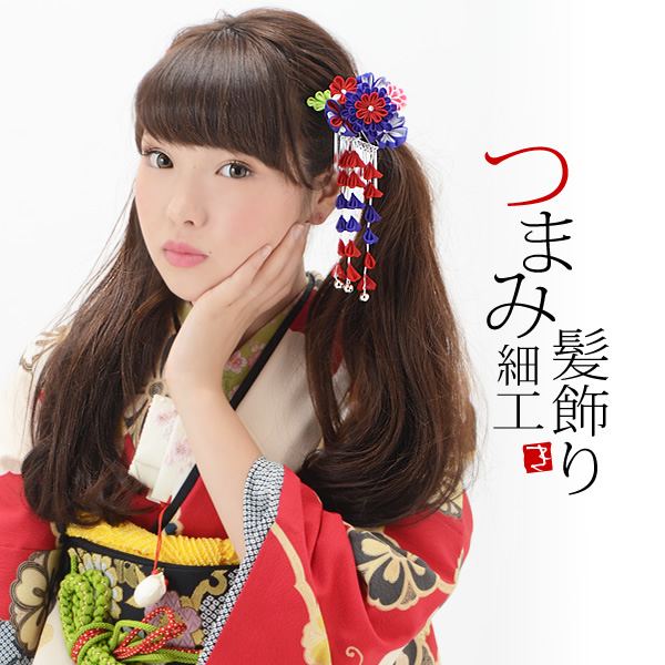 【Prices down3】成人式 髪飾り つまみ細工 髪飾り単品「ブルー×レッド 丸菊つまみ」簪 つまみ細工かんざし 成人式 卒業式の袴にも (TN14-2)ss2512wkk40