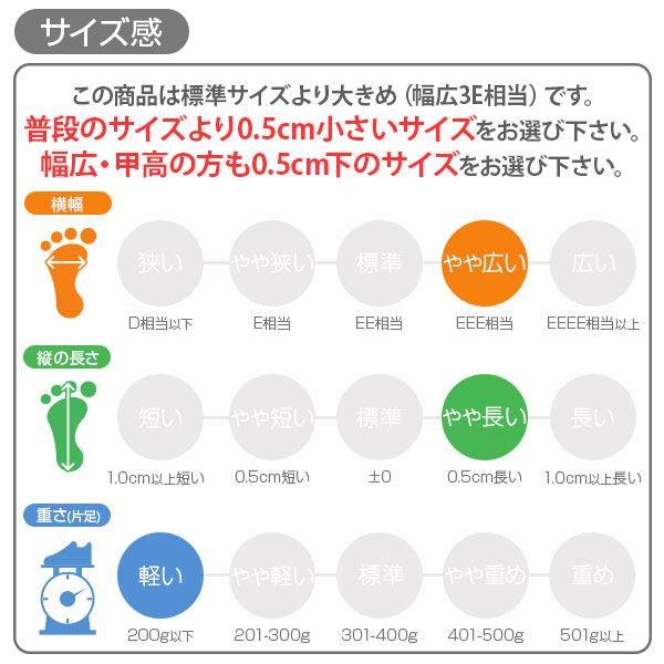 | こちらの商品は【標準サイズより大きめ】です。普段お履きのサイズより0.5cm小さいサイズをオススメします。 |
