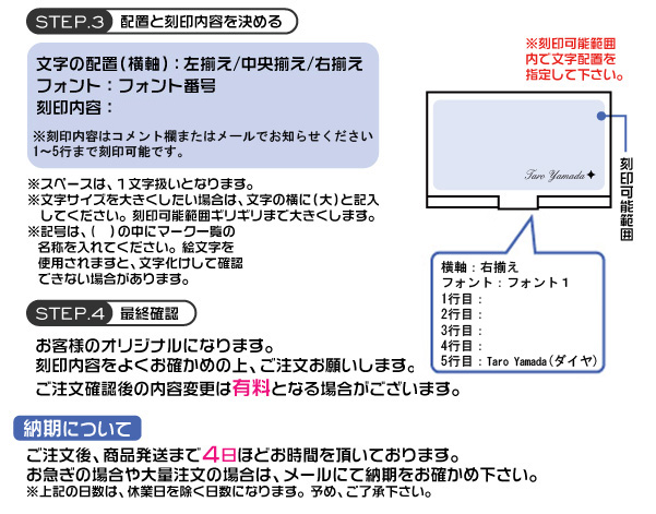 ※各行22文字まで刻印可能です。文字を大きくする場合は大きくする文字の横に(大)とお書きください。