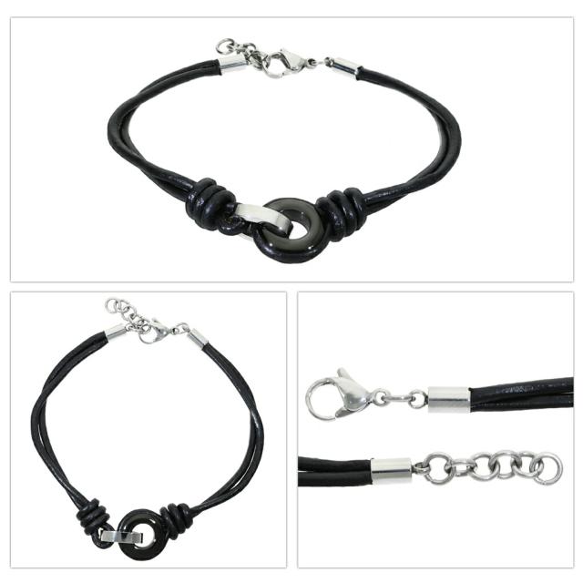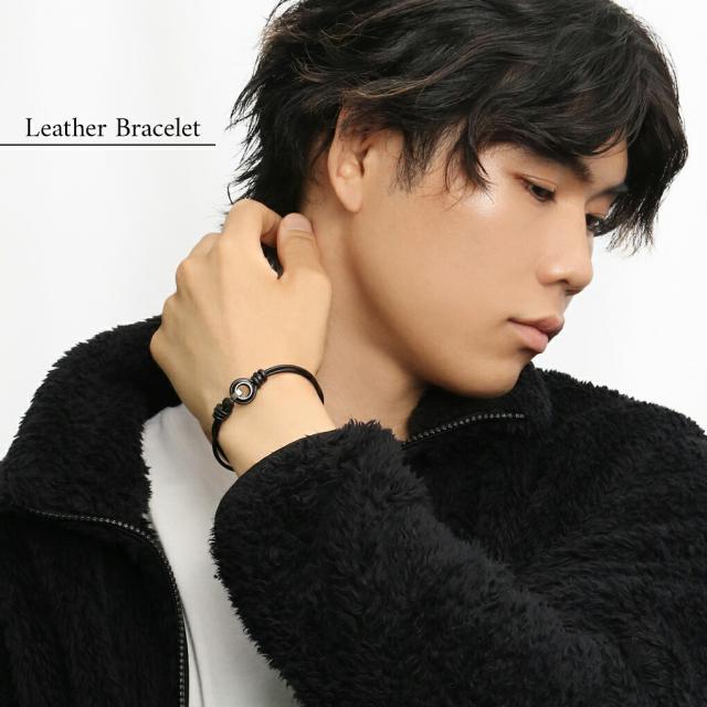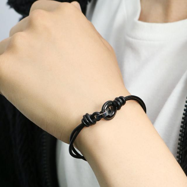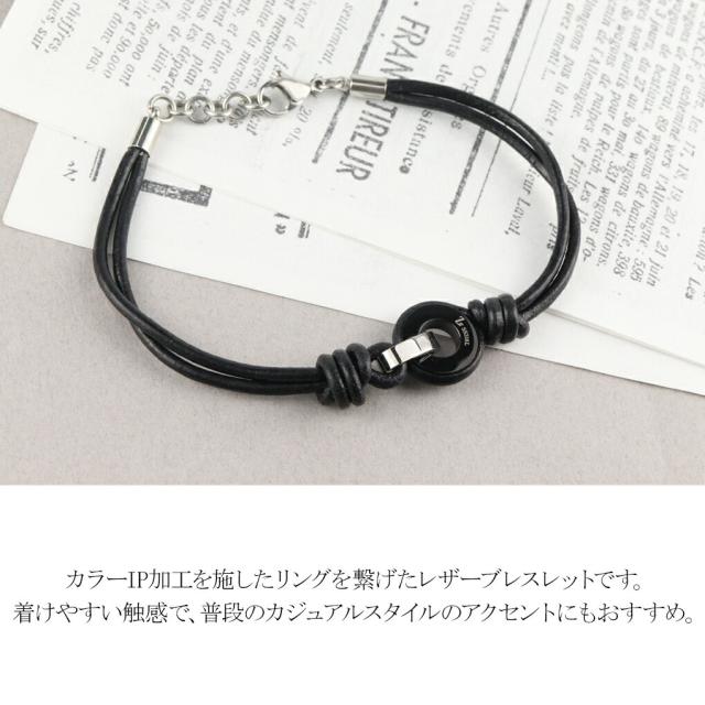 カラーIP加工を施したリングを繋げたレザーブレスレットです。