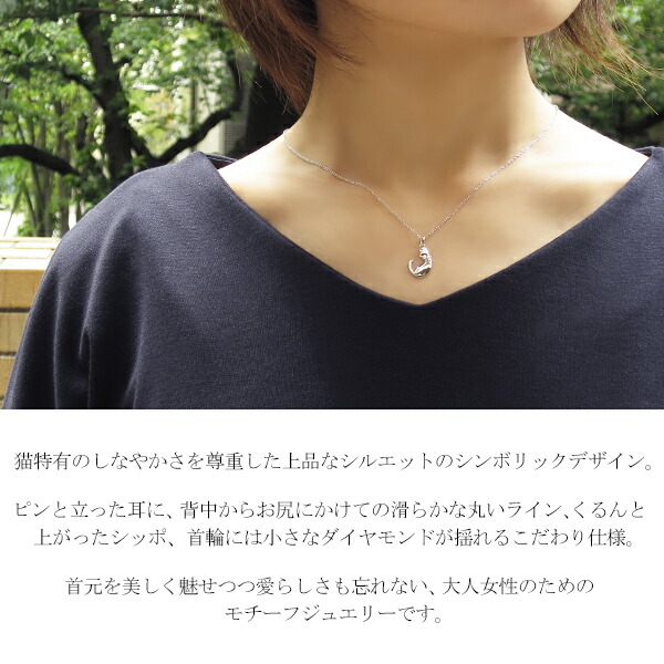 天然 ダイヤモンド ねこ ドロップ シルエット ネックレス シルバー925 ロジウムコート ピンクゴールドカラーコート シンプル 猫 ネコ 猫ペンダント