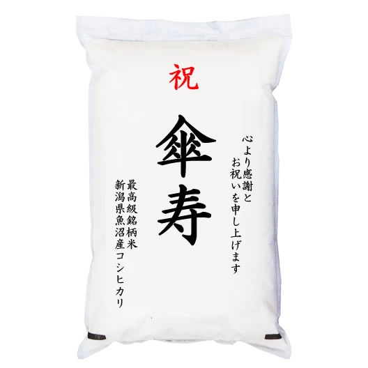 傘寿 さんじゅ 数え年80歳 「傘」の略字が八十に見えることから傘寿といわれる 。感謝とお祝のしるしとして、最高級銘柄米 新潟県魚沼産コシヒカリ(化粧箱入り) を送りましょう。お祝の風呂敷でお包みする選択もできます。