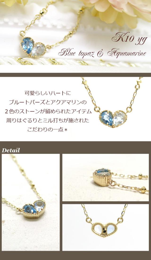 ※天然石の色味や光加減が写真と多少異なる場合がございます。ご了承下さい。K10YG ブルートパーズ アクアマリンハート ミル打ちネックレス レディース ハーフダブルカラー