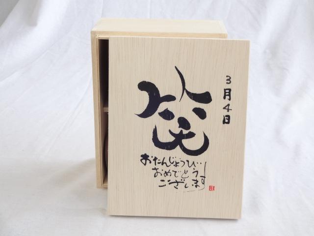 誕生日3月4日セット おたんじょうびおめでとうございます 笑う門には福来たる木箱ペアカップセット(日本製萬古焼き) 陶芸作家 安藤嘉規作×デザイン書道家 榮田 清峰作