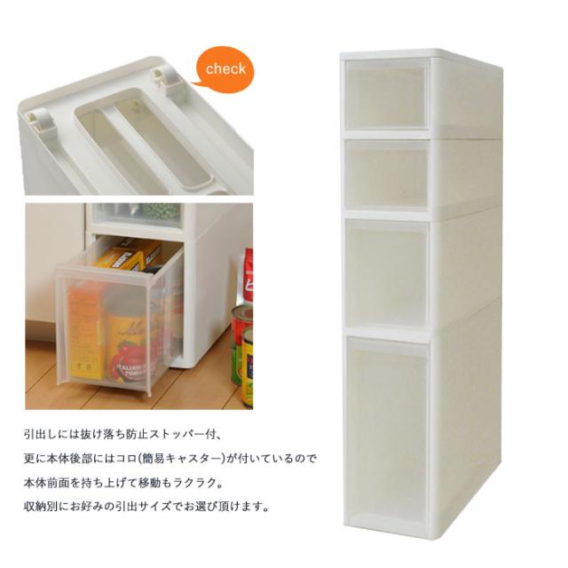 ランドリーや省スペースの収納に大活躍!あると便利な収納ストッカーわずか幅18センチのスリムストッカーはキッチンストッカーとしてもOKな収納ラック。 キッチンでのお使いの場合は食糧庫としてもランドリー付近でのお使いの場合は洗剤や柔軟剤などの買い置きを収納できそうですね。 引出しには抜け落ち防止ストッパー付、更に本体後部にはコロ(簡易キャスター)が付いているので本体前面を持ち上げて移動もラクラク。 収納別にお好みの引出サイズでお選び頂けます。 【仕様】■サイズ:約幅18×奥行40×高さ85cm■内寸:[引出](S)約幅12.7×奥行36×高さ11.4cm×2(M)約幅12.6×奥行36×高さ18.2cm×1(L)約幅12.4×奥行35.8×高さ32cm×1■材質:[天板・枠・引出・コロ]ポリプロピレン■重量:約3.9kg■生産国:日本製■組立区分:完成品■その他:本体底面コロ付き■サイズ:約幅18×奥行40×高さ85cm■内寸:[引出](S)約幅12.7×奥行36×高さ11.4cm×2(M)約幅12.6×奥行36×高さ18.2cm×1(L)約幅12.4×奥行35.8×高さ32cm×1■材質:[天板・枠・引出・コロ]ポリプロピレン■重量:約3.9kg■生産国:日本製■組立区分:完成品■その他:本体底面コロ付き
