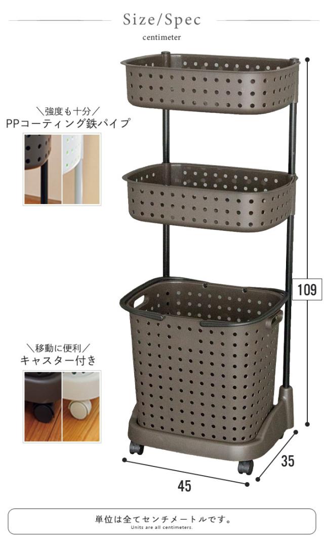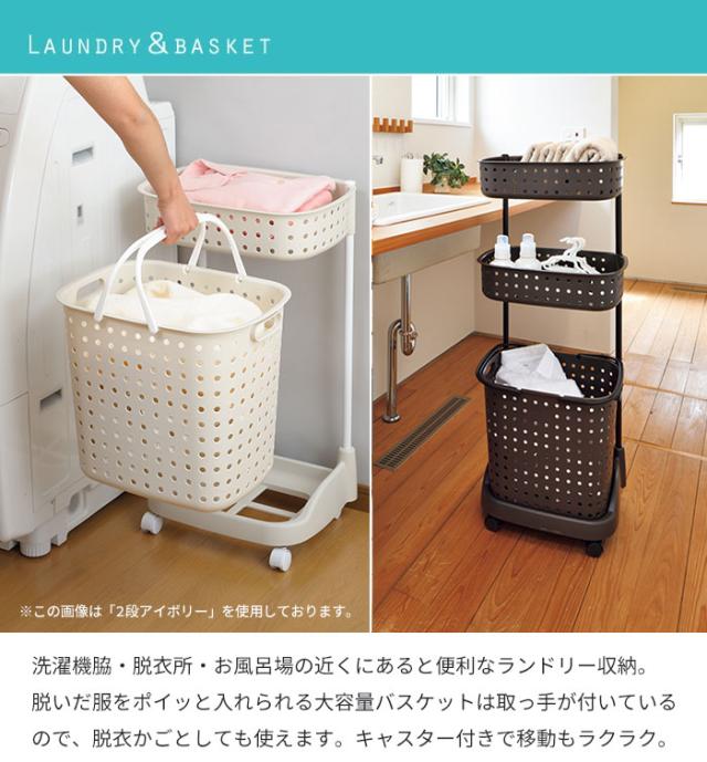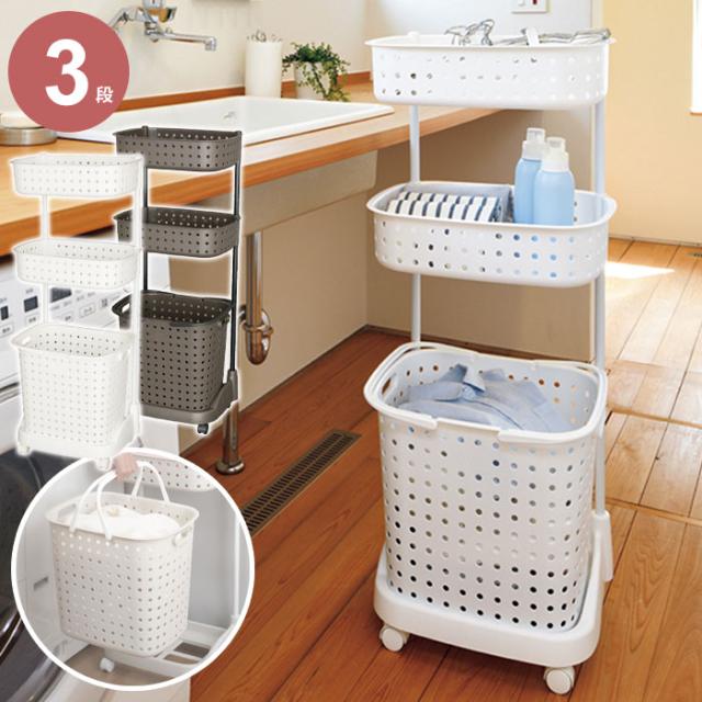 3段のバスケットには洗濯物を分類して入れたり、上段はタオルや着替えを置いて、下段は脱いだ服、というように仕分けて使用することもできます。下段バスケットは取り外しができるので、洗濯物を干す際にも使えます。