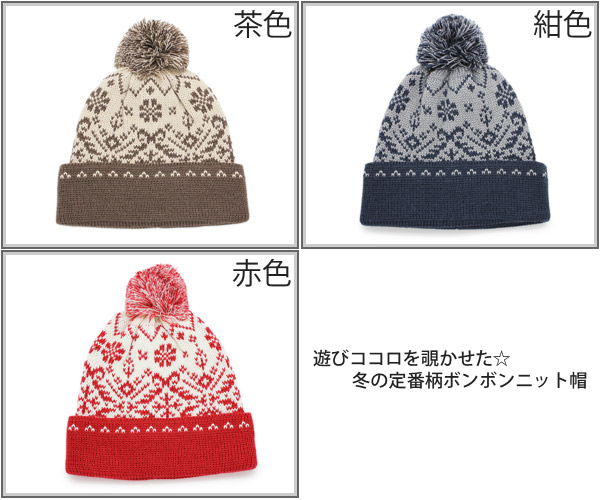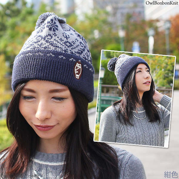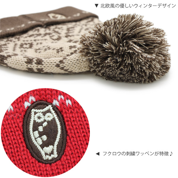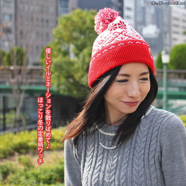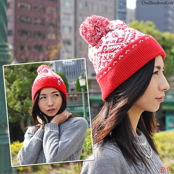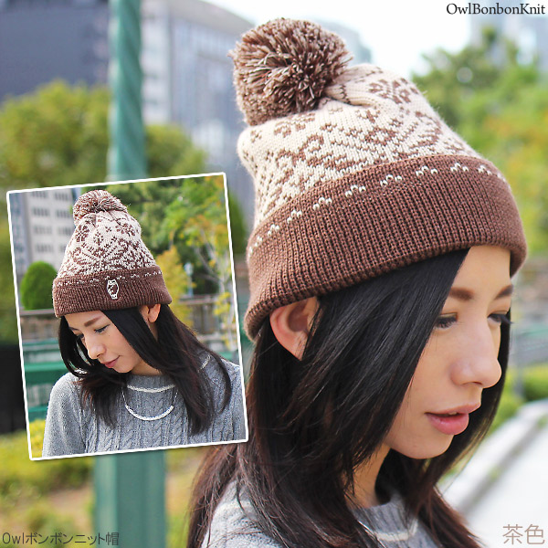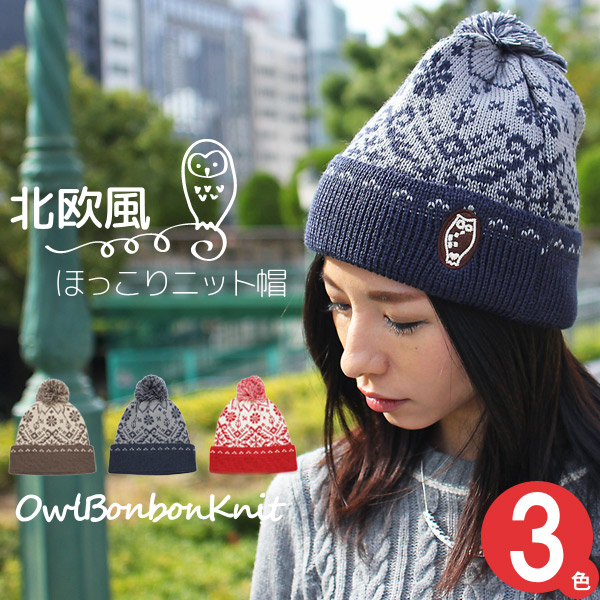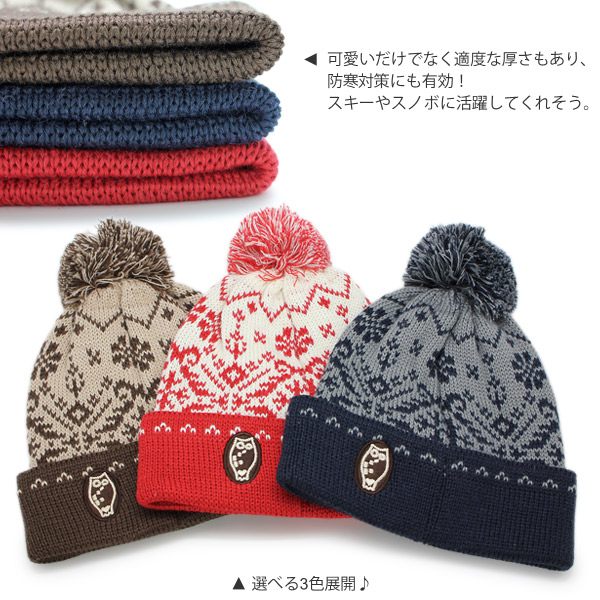 ボンボンニット帽 防寒 [メール便可] レディース 帽子 秋冬 北欧 キュート リブ編み / Owlボンボンニット帽