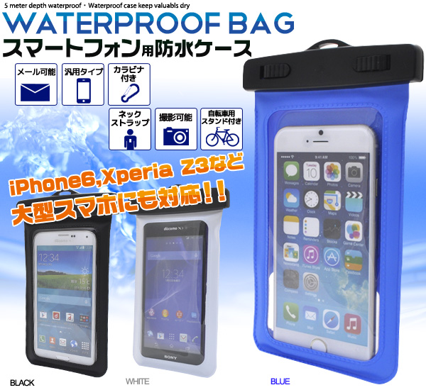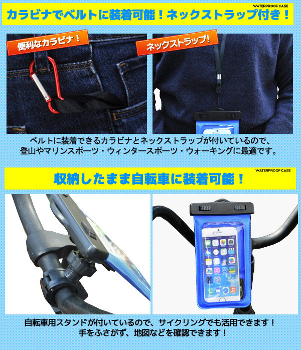 防水ケース 大型タイプ 自転車用スタンド ストラップ カラビナ付き iPhone android スマートフォン 防水 スマホケース お風呂 台所 水場 キッチン アウトドア 海水浴 プール お庭 水遊び お家時間 巣ごもり キャンプ マリンスポーツ ウィンタースポーツ スノボ スキー 雪遊び