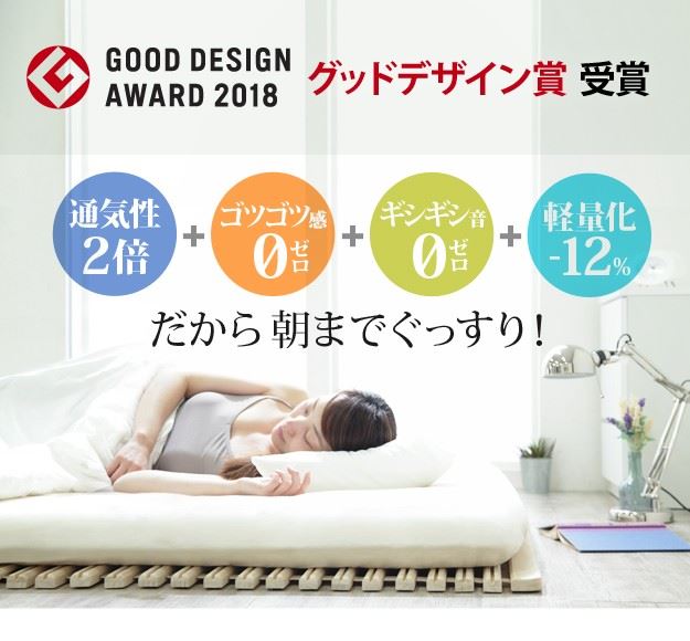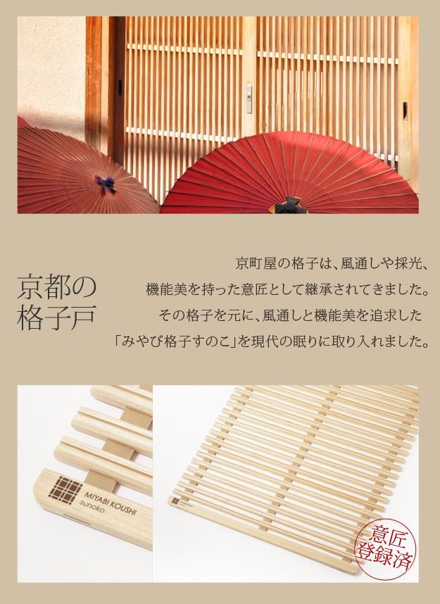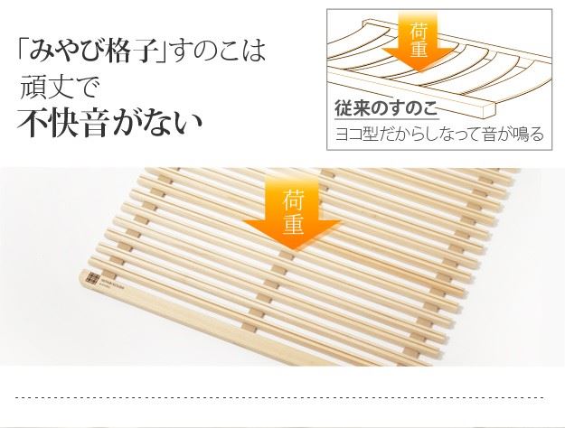 ●「みやび格子」すのこは点で支えるからゴツゴツしない、更に頑丈な構造のため、軋み音などの不快音がありません。