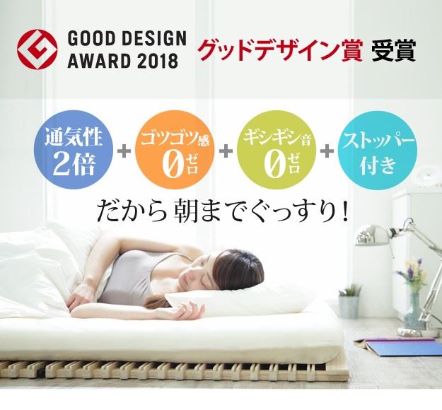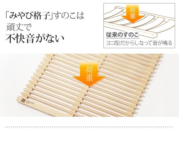 ●「みやび格子」すのこは点で支えるからゴツゴツしない、更に頑丈な構造のため、軋み音などの不快音がありません。
