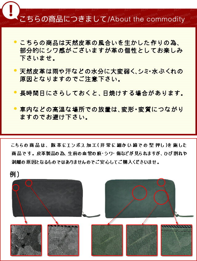 | 豚革に、角度によって見え方が変化する迷彩柄のエンボス型押しを施したこちらの二つ折り財布。 内側は素上げの革を使用しており、2種類の表情がお楽しみ頂けます! 仕切りが多く、定期等の収納に便利なクリアポケット付きで整理整頓が楽々。 小銭入れや札入れ内にも、カードポケット・フリーポケット付きです! 豊富なカラーバリエーションで、年齢・性別問わず使えるのも嬉しいポイント。 |