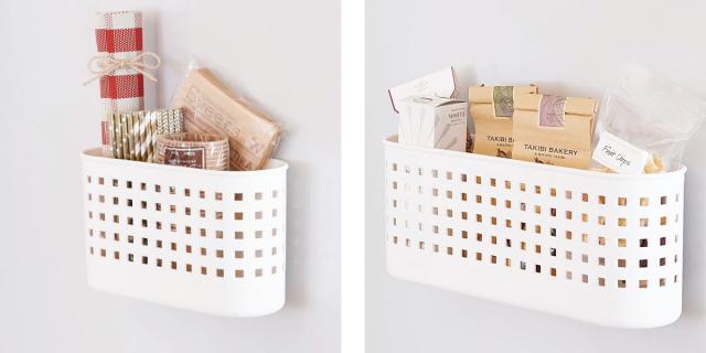 散らかりがちな小物をまとめてたっぷり収納できるワイドサイズのバスケットです。すぐ使いたいけど置き場所に困っていた物も、サッと使うことができるのでお料理もはかどります。2枚の仕切りが付いているので、収納した物が倒れたりすることがなく安定感があります。また、マグネットでの取り付けなので、ちょっとした収納スペースを作ることができて便利です。
