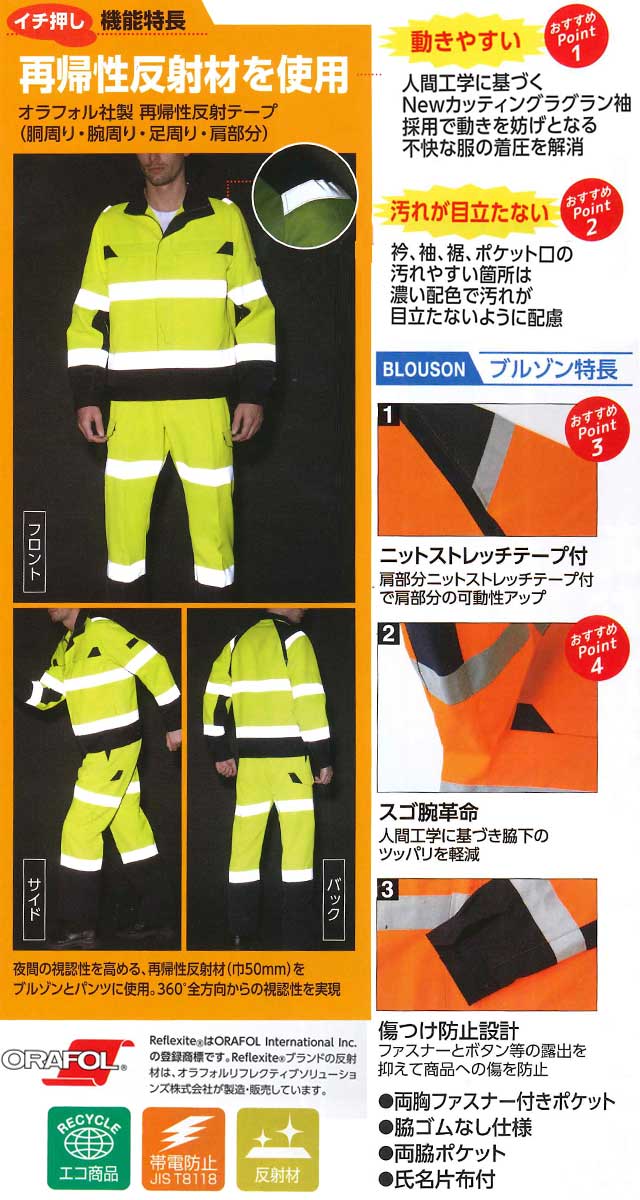 動きやすさと視認性を追求した着用者の安全性を確保する作業服です。昼夜作業時の危険からあなたを守る高視認性安全服です。