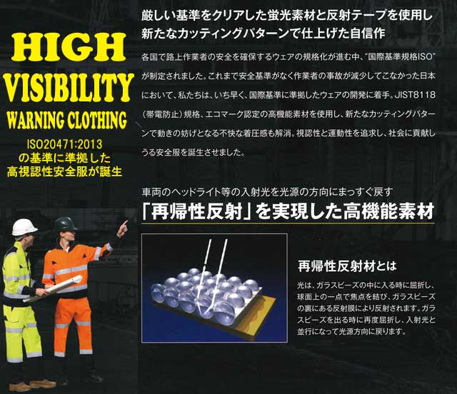 着用者の安全性を確保する高視認性防水防寒ウェアです。車両のヘッドライト等の入射光を光源の方向にまっすぐ戻す再帰省反射を実現した高機能素材です。