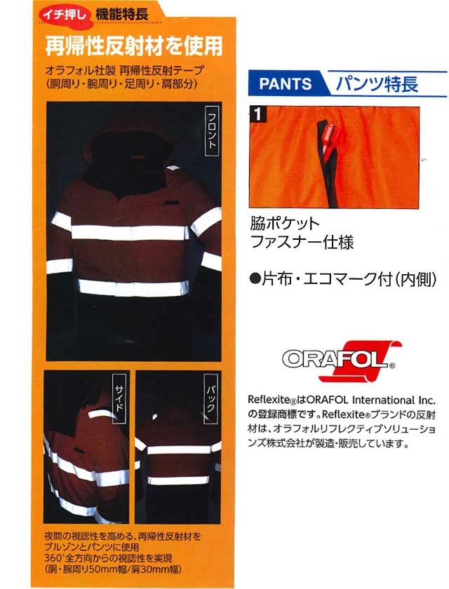 着用者の安全性を確保する高視認性防水防寒ウェアです。車両のヘッドライト等の入射光を光源の方向にまっすぐ戻す再帰省反射を実現した高機能素材です。