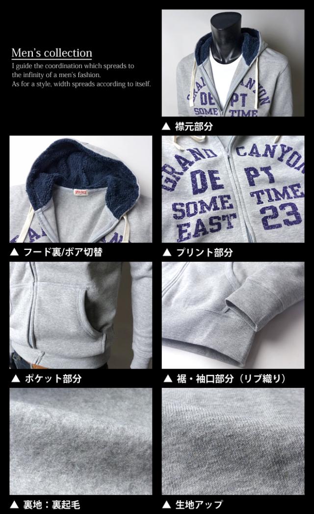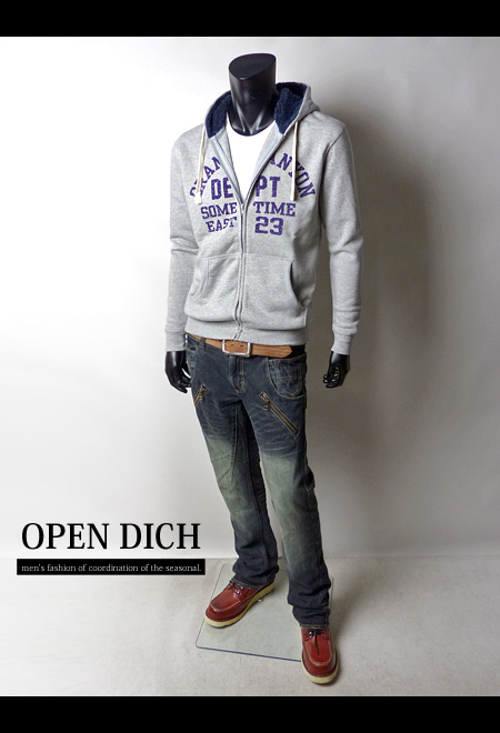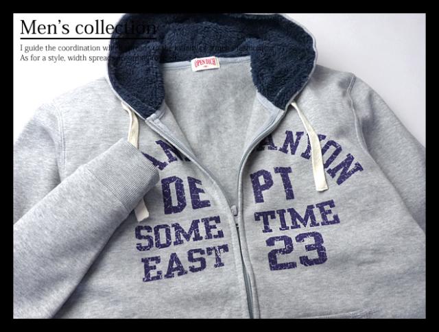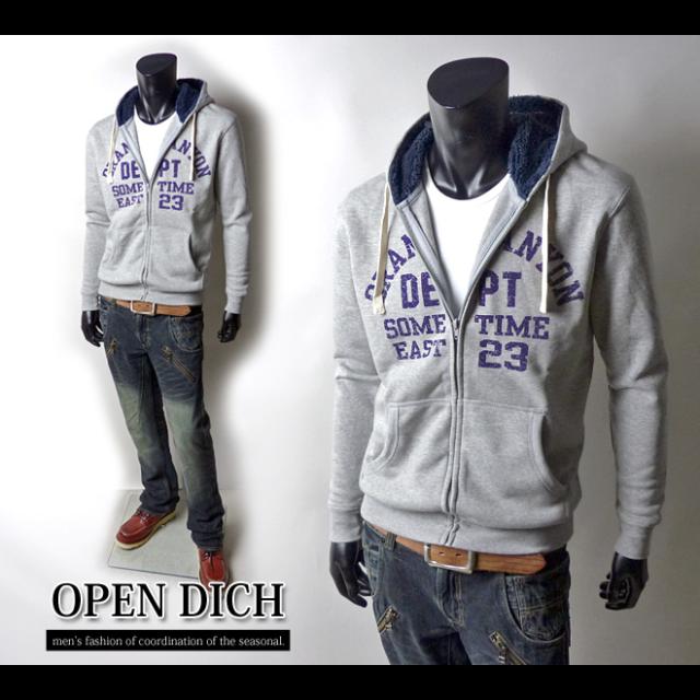メンズ 裏起毛 ジップパーカー OPENDICH アメカジロゴ フードシャギーボア切替 トレーナー