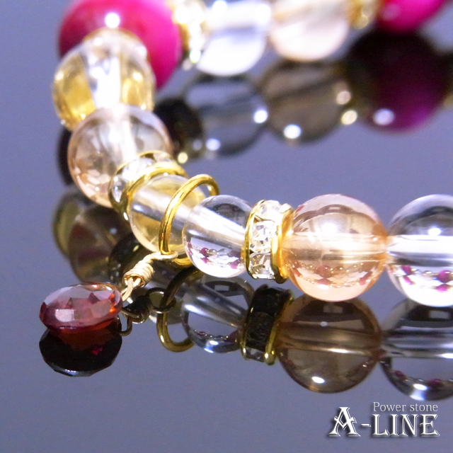 ガーネット(ワイヤー)・ピンクタイガーアイ(染め)10mm・ゴールデンオーラクリスタル&水晶8mm・水晶6mm・合金ロンデル・国産高級オペロンゴム